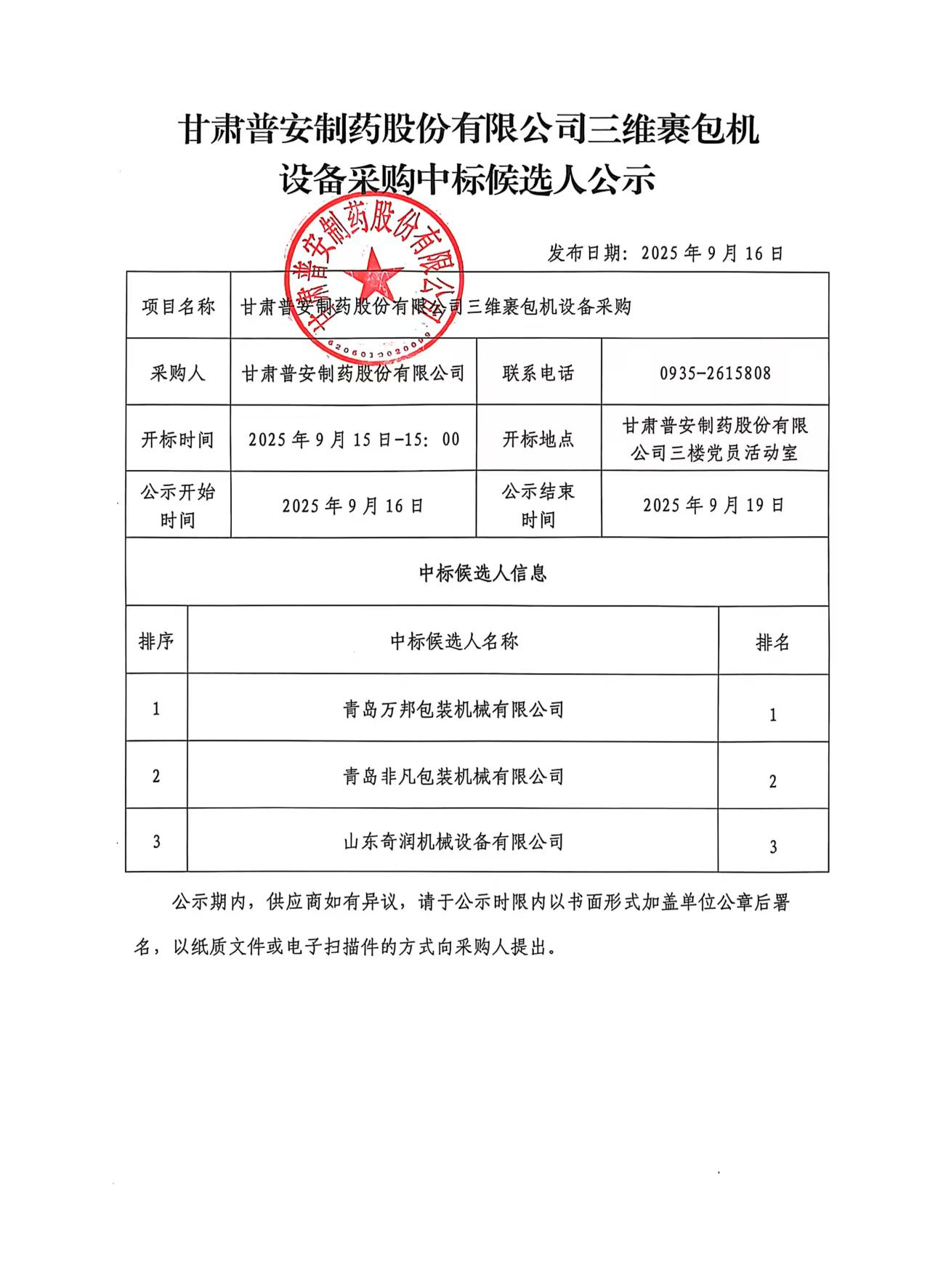 甘肅普安制藥股份有限公司三維裹包機設備采購中標候選人公示