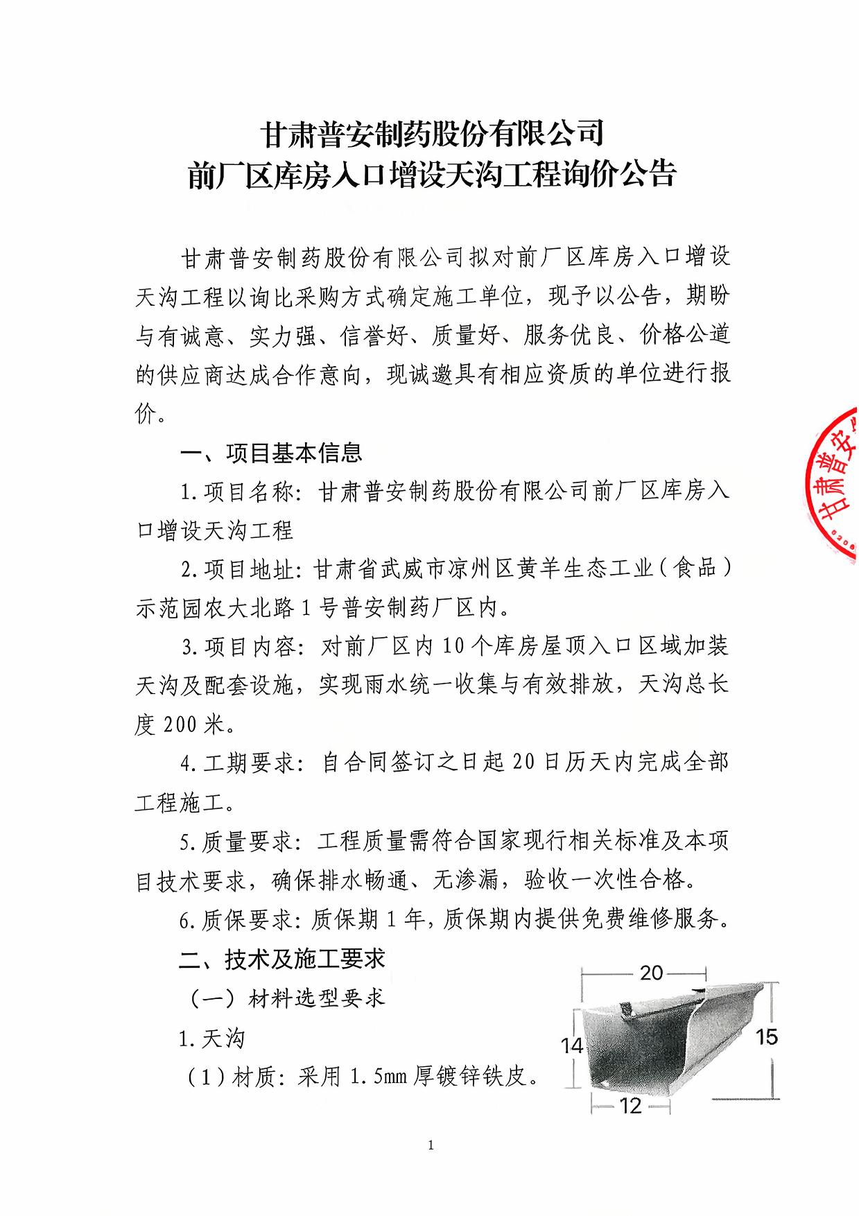 甘肅普安制藥股份有限公司前廠區(qū)庫房入口增設(shè)天溝工程詢價公告